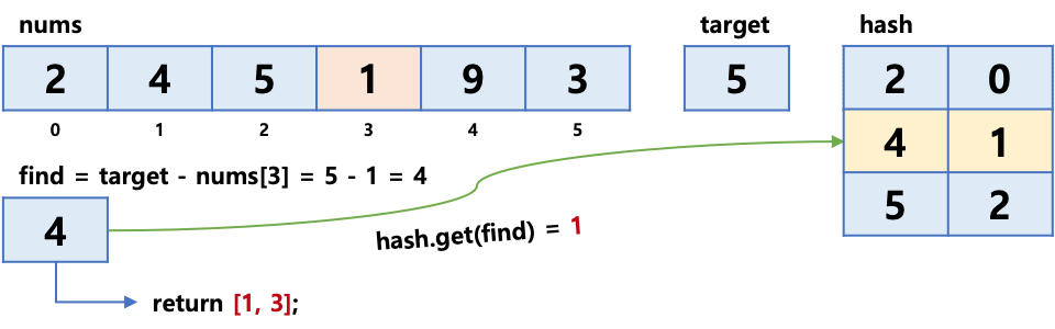 hash에서 4를 찾을 수 있으며, [hash.get(find), index] 를 리턴하면 끝!